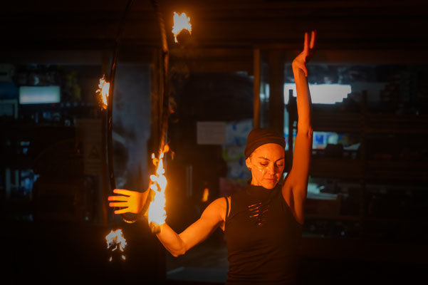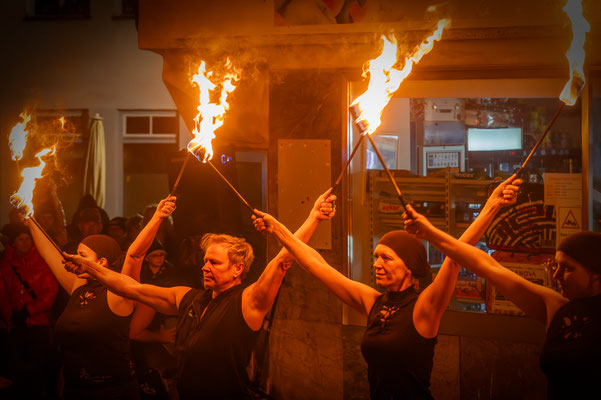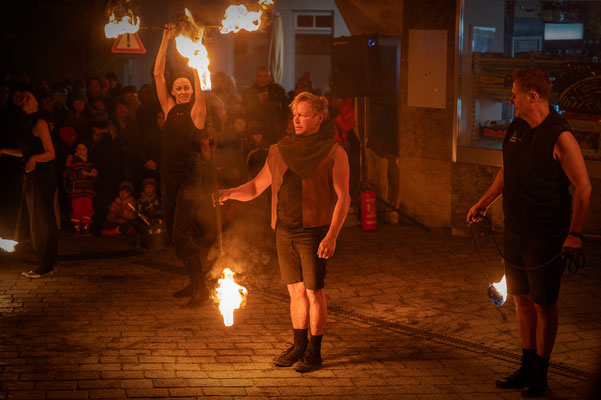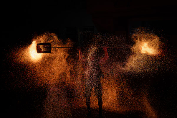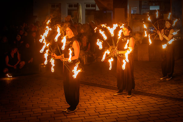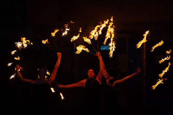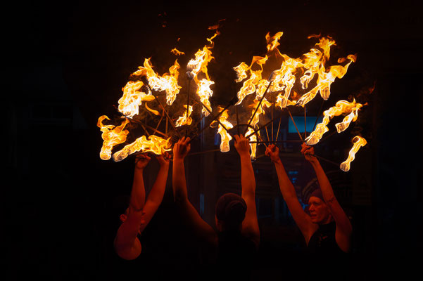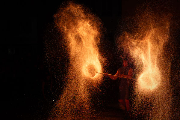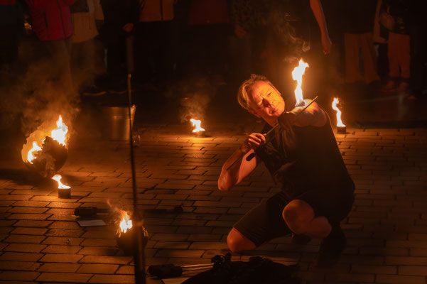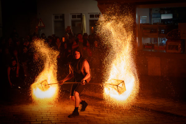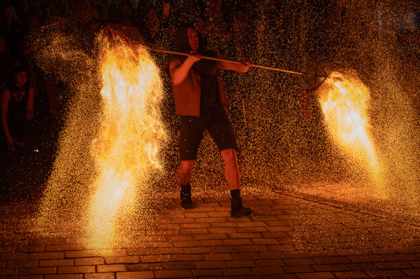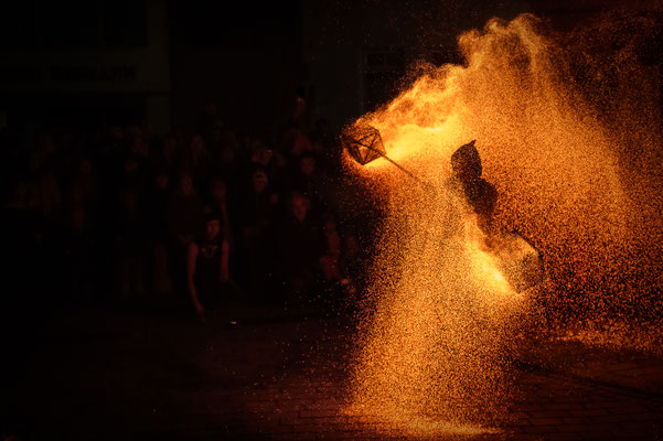 Es kamen wieder allerlei Feuerrequisiten zum Einsatz. Mit dabei waren Kunststücke mit Fackeln, Feuerschlucker und Feuerspucker, Feuerstäbe und Feuerpoi. Mein Highlight dieses Mal war die Aufführung mit der abbrennenden Stahlwolle.